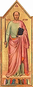 Bernardo Daddi's *Saint Paul and a Group Worshippers* (1333) is a striking example of early Italian Renaissance painting, crafted in tempera on panel. tall, narrow work—measuring nearly 225 cm high—likely served as a devotional panel or part of a larger altarpiece, depicting apostle Saint Paul surrounded by adoring figures. The medium of tempera, made from pigments bound with egg yolk, allowed Daddi to achieve vibrant colors and intricate details that glow with spiritual intensity, a hallmark of 14th-century Florentine art. Active in Florence during the Trecento period, Daddi was a leading follower of Giotto, blending Gothic elegance with emerging naturalistic tendencies. His style features graceful figures, delicate drapery, and a sense of depth through subtle modeling, bridging medieval iconography and Renaissance humanism. Created amid the Black Death's shadow and Florence's artistic flowering, the painting reflects deep religious devotion, inviting worshippers to contemplate Saint Paul's teachings. Today, housed in the National Gallery of Art's Andrew W. Mellon Collection, this panel exemplifies Daddi's mastery of small-scale religious narratives. Its preservation offers a window into medieval piety and the technical virtuosity that paved the way for later masters like Masaccio.