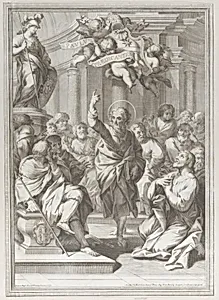 Saint Paul preaching at center, standing in a crowd in a columned interior, pointing upwards toward putti who hold a scroll