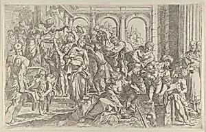 Saint Roch at left distributing alms to a group of people gathered around him, after Annibale Caracci
