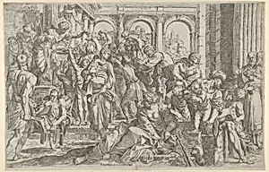 Saint Roch at left distributing alms to a group of people gathered around him, after Annibale Caracci