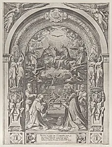 Saints Lawrence, Sixtus, Peter, and Paul adoring the Coronation of the Virgin by Christ above