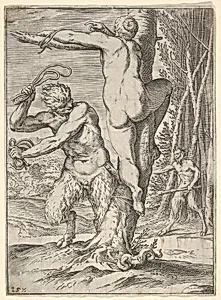 Satyr whipping a nymph, who is shown from behind and bound to a tree, a second satyr bearing a club stands in the middle ground