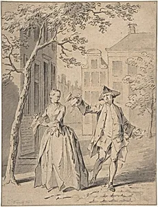 "Scene from a Comedy," a captivating drawing attributed to Cornelis Troost and Jacob Buys (dated circa 1740–1801), offers a lively glimpse into 18th-century Dutch theatrical culture. Troost, a master of Rococo genre scenes and caricatures, specialized in capturing the exuberant world of Dutch comedy theater, often featuring exaggerated expressions and witty vignettes. Here, men and women—likely actors in costume—interact amid buildings and trees, evoking a comedic outdoor tableau that blends humor with everyday charm. This sheet, measuring 10 7/8 x 8 3/8 inches, exemplifies the playful spirit ...