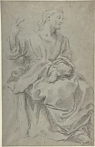 Giovanni Lanfranco (1582–1647), a leading figure of the Italian Baroque, masterfully captured movement and emotion in his drawings, often as preparatory studies for grand frescoes and altarpieces. This double-sided sheet features on the recto a contemplative seated male figure draped in flowing fabric, rendered with fluid black chalk lines that emphasize volume and texture. The verso bursts with energetic sketches of playful putti—chubby, winged cherubs—hinting at Lanfranco's dynamic compositions for religious or mythological scenes, influenced by his mentors, the Carracci brothers, in Bologna...