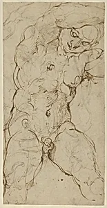 Seated Nude Male Figure (recto); Ornamental Designs of Foliage, a Grotesque Head, and a Leg (verso)