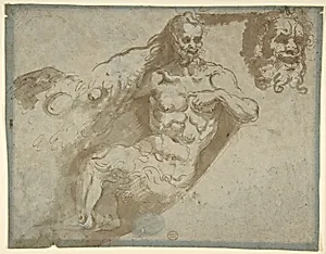Seated satyr, with enlarged head of same (recto); head of a woman (verso)