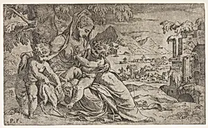 Seated Virgin and Child with Saint John the Baptist and a lamb on a hillside