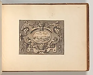 Cornelis Bos, a prominent Dutch engraver active in Antwerp during the mid-16th century, this enchanting *Series of Cartouches* part of his album *Targhe ed ornati di varie eciose invenzioni (Cartouches and other of various and capricious), around 1545–60. This engraving, measuring about 8¼ × 10⅝ inches overall, showcases intricate decorative frames—known as cartouches—adorned with muscular male figures, fantastical motifs, and scrolling elements. Rendered in fine lines on a metal plate, the print exemplifies Renaissance ornamental design, blending Northern precision with Italian-inspired grote...