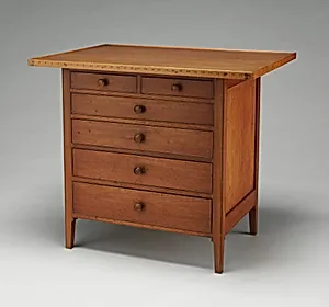 Nestled in the American Wing of the Metropolitan Museum Art, this *Sewing Table* (1843), crafted by James X. of the United Society of Bel in Christ’s Second Appe—better known as the Shakersexemplifies the sect's profound commitment to simplicity and utility. Measuring a compact 28 x 32½ x 23½ inches, the table is ingeniously designed for everyday use in Shaker communities, where sewing was a communal task essential to their self-sufficient lifestyle. Its clean lines and lack of ornamentation reflect the Shakers' spiritual ethos: "Beauty rests in utility," as one of their maxims proclaimed. Constructed from an array of native woods—cherry, butternut, pine, basswood, sycamore, and maple—the piece showcases masterful joinery techniques honed in Shaker workshops. Each wood type was selected for its strength and workability, with lighter species like pine and basswood often used for secondary elements, ensuring both durability and lightness. This multi-wood construction highlights the Shakers' resourceful use of local materials during the early 19th century, when their New England and Midwestern settlements thrived. As a pinnacle of Shaker furniture, this table transcends mere function to embody American folk art's democratic ideals. Acquired through the Friends of the American Wing Fund in 1966, it invites visitors to appreciate how Shaker craftsmanship elevated the ordinary into the sublime, influencing modern design with its timeless minimalism.
