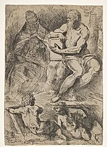 Sheet of studies with St. Jerome, seated at right and resting his right forearm on a book, at left an ecclesiastical figure wearing a cope and miter, and at bottom two putti