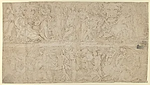Sheet with Drawings after Roman relief decorations from objects in the Collection of Cardinal Bruto della Valle. Recto: Friezes from Roman Sarcophagi with Dyonisus; Marble Funerary Relief of Lucius Antistius Sarculo and his wife Antistia Plutia