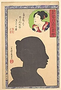 This striking *Silhouette Image of Kabuki Actor* Utagawa Yoshiiku the dramatic flair of Japan's Kabuki theater through a masterful woodblock print. Created in the Meiji period (1868–2), the work features a profile view of an actor—likely portraying a female role, as suggested by the tags—rendered in bold ink and vibrant colors on paper. Measuring about 14½ x 9½ inches, its intimate scale invites close viewing, evoking the shadowy elegance of a stage spotlight. Yoshiiku, a prominent ukiyo-e artist from the Utagawa school, specialized in yakusha-e (actor prints) that celebrated the larger-than-...