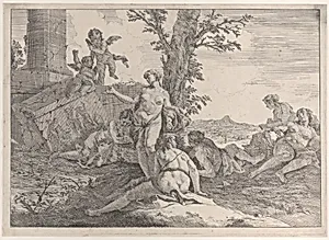 In the lively etching *Six Nymphs and Two Putti*, from Francesco Fontebasso's series *Bacchanals and Histories* (1744), visitors encounter the exuberant spirit of Venetian Rococo art. Fontebasso, a prominent 18th-century Italian painter printmaker active in Venice, drew inspiration from the dramatic, playful style of Giovanni Battista Tiepolo. Created during Venice's golden age of decorative arts, this work captures the era's fascination with mythological revelry, evoking the joyous abandon of Bacchanalian feasts dedicated to the god Dionysus (Bacchus). The scene bursts with six graceful nymp...