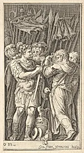 Soldiers, one shown frontally and holding a sword, at right a soldier with his back turned and holding a cup, four soldiers standing behind them with standards and spears, after the lost frescoes by Polidoro da Caravaggio on the façade of the Milesi Palace in Via della Maschera d'Oro, Rome