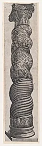This engraving depicts a grotesque winding column from St. Peter's Basilica in Rome, part of the "Speculum Romanae Magnificentiae" series published in the 16th century. The print shows one of the ornately decorated spiral columns from the old St. Peter's, rendered with careful attention to the intricate relief carving covering its surface. The column displays the elaborate decorative vocabulary of ancient Roman architecture, featuring foliate scrollwork, figures, and ornamental details. Nicolas ...