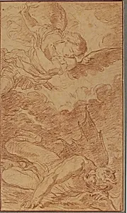In the spirited drawing *St. Michael Casting Down, after Pier Francesco M*, created in the 18th century by Louis Jacques Durameau, witness a dramatic biblical showdown. Durameau, a skilled French draftsman, faithfully reinterprets the Baroque master's vision of the Archangel Michael triumphing over the fallen angel Lucifer—a scene drawn from the Book of Revelation. Pier Francesco Mola (1612–1666), an Italian artist known for his dynamic compositions and theatrical lighting, inspired this work, capturing the eternal struggle between good and evil with angelic vigor and infernal defeat. Execute...