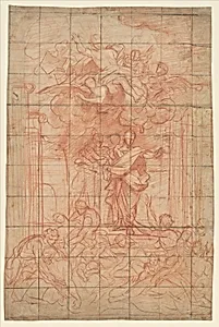 Red chalk, squared in black chalk on beige paper; contours incised. A sheet measuring 39.1 x 28.8 cm has been affixed to the center of the larger sheet. Verso blackened for transfer.