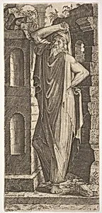 St. Philip(?), standing with his left hand on his hip and his right hand resting on his head, masonry walls to his right and behind him, from "Christ and the Twelve Apostles"