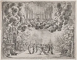 Stage design with allegorical figures; from 'L'Idea di tutti le perfezioni ... Piacenza'