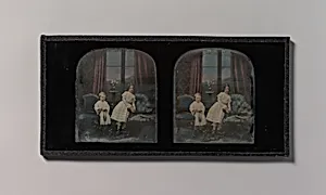 [Stereograph, Two Children Standing Between Furniture in a Studio Parlor Setting]
