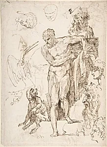 Studies and Sketches for Figures: Standing Male Nude in Frontal View, Male Heads, Seated Monkey, and a Long-Beaked Bird (a Stork?) (recto); Figure Studies: Back View of Standing Male and Female Heads, a Flying Long-Beaked Bird, etc. (verso)
