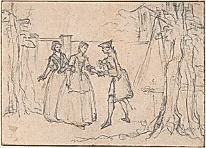 Hubert François Gravelot, leading French Rococo artist and engraver active in 18th-century London, created this delicate *Study for an Engraving of " in the Opera of Flora around 1737.ot, known for his intricate book illustrations and theatrical designs, often prepared such studies as preparatory sketches for engravings that would adorn printed music sheets or opera librettos. This piece captures the lively world of Baroque opera culture, likely depicting male and female figures in pastoral or mythological scenes inspired by *Flora*, a popular opera-ballet celebrating the goddess of flowers an...