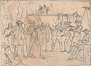 Hubert François Gravelot, a prominent French rococo artist and engraver active in 18th-century Paris and London, created this delicate *Study for an Engraving of " in the Opera of Flora around 1737.ed in pen and blue ink with black accents and faint traces of red chalk, the small drawing (just 2 13/16 x 4 inches) exemplifies the preparatory sketches artists used to refine compositions before committing to print. Gravelot's intricate line work captures dynamic figures—likely men wielding swords, evoking theatrical drama—hinting at scenes from the opera *Flora*, a popular work celebrating the Ro...