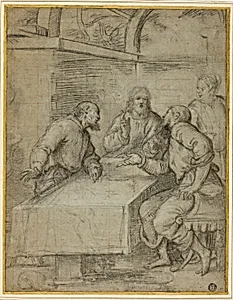 Giulio Campi's *Study for the Supper atus* (c. 1550–59) is a captivating preparatory drawing that brings to life the biblical scene from Luke's Gospel, where the resurrected Christ reveals himself to two disciples over a humble meal. As a member of the prolific Campi family of artists from Cremona, Italy, Giulio worked in the late Renaissance tradition, blending intricate detail with emotional depth. This sheet, now housed in the Art Institute of Chicago Prints and Drawings Department, exemplifies his skill in capturing human gesture and narrative drama through a sketch destined for a larger p...