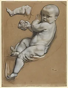 Frederick Goodall's *Study of a Baby*1868) is a tender preparatory drawing that captures the soft contours and innocent charm of an infant, rendered in black and white chalk on brown. Measuring 21 5/16 × 16 5/16 inches, this work exemplifies the artist's skill in quick, expressive studies during the Victorian era, a time when detailed sketches often served as foundations for larger oil paintings. Housed in the Metropolitan Museum Art's Department of Drawings and Prints, was generously gifted in 2014 by Paul Jeromack and Robert Tuggle in honor of George R. Goldner. The choice of medium is part...