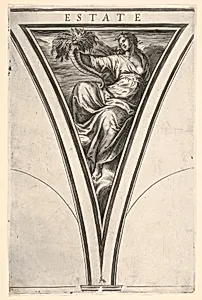 Summer (Estate), represented as a robed woman bearing a horn of plenty, a spandrel-shaped composition from the series 'The Four Seasons'