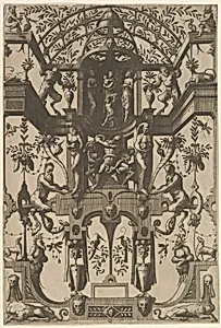 Surface Decoration, Grotesque with Strapwork, including Double Wall Niche, at the Top the Christian Virtues Faith, Hope and Charity, at the Center the Laocoon from Veelderleij Veranderinghe van grotissen ende Compertimenten...Libro Primo