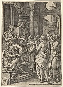 Heinrich Aldegre's *Susanna Accused ofultery, from The of Susanna* (1555) captures a dramatic moment from the biblical Apocrypha in the Book of Daniel. this tale, the virtuous Susanna faces false accusations of adultery by two lecherous elders, highlighting themes of injustice, chastity, and divine intervention. Aldegrever, a German engraver from Soest and one of the Renaissance "Little Masters," specialized in intricate small-scale prints like this one, measuring just 4 9/16 × 3 1/4 inches. As an engraving, the work showcases Aldegrever's mastery of the burin technique, where fine lines inci...