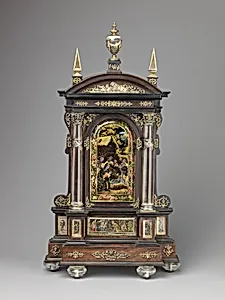 Ebony-veneered soft wood, silver gilt, rock crystal, agate, and reverse painted and gilded glass.