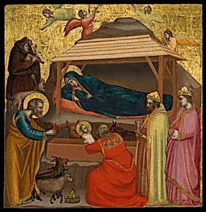 Giotto di Bondone's *The Adoration of the*, possibly dating to around 1320, marks a pivotal shift in Western art, bridging medieval traditions with the emerging Renaissance. Painted in tempera on wood with a shimmering gold ground—a technique that evoked divine light and continuity with Byzantine icons— this small panel (17 3/4 x 17 1/4 in.) captures the biblical scene with groundbreaking realism. Born in Florence around 7, Giotto revolutionized painting by abandoning flat, stylized Byzantine forms for naturalistic depictions of space, volume, and human emotion, earning praise from contemporar...