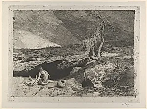 The Anchorite: a partially naked man seated at left in a landscape with what appears to be a long sheet unfolded over his knees