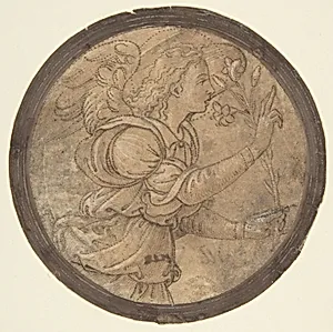 Pen and brown ink, brush and brown wash, highlighted with white gouache, over black chalk on paper washed brown; outlines of design and framing outlines pricked and with traces of rubbed black pouncing dust