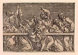 The Apostles Looking at Christ and the Virgin in a Glory of Angels (bottom left plate) by Léon Davent|Giulio Romano
