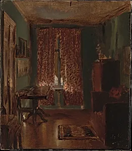 Adolph Menzel's *The Artist's Sitting Room Ritterstrasse* (1851) offers an intimate glimpse into the daily life of this pioneering German Realist painter. Painted as a modest oil on cardboard—just 12⅝ × 10⅝ inches—this work captures the cluttered coziness of Menzel's Berlin apartment on Ritterstrasse, filled with everyday objects like books, papers, and personal effects. Created during a transformative period in European art, when Realism began challenging Romantic idealism, Menzel's interiors celebrated the beauty of ordinary domestic spaces amid Prussia's industrializing capital. Menzel's m...