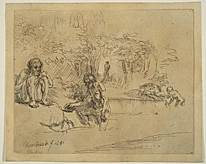 Step into the intimate world of Rembrandt van R's *The Bathers* (1651), a masterful etching now housed in the Metropolitan Museum Art's Drawings and Prints. This small-scale print, measuring just 4 3/4 × 5 13/16 inches (12 × 14.7 cm), depicts a group of men engaged in bathing—a theme drawn from everyday life yet infused with classical echoes. Acquired through the bequest of Harry G. Friedman 1965, it the third and final state of three, showcasing Rembrandt's iterative refinement process. As a cornerstone of the Dutch Golden Age and Baroque art, Rembrandt revolutionized etching, a technique wh...