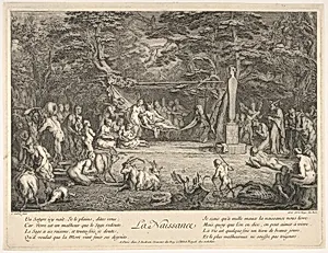 The Birth (La Naissance): in a forest, the new mother resting in a hammock at center, the newborn below her to left, various satyrs and goats surrounding, from 'The lives of satyrs' (La vie des satyres)