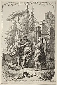 Behold *The Blind Tobias*, a captivating 18th-century print by Joseph Wagner after a design by the Italian artist Giuseppe Zocchi, circa 1745. This work draws from the biblical Book of Tobit, depicting the moment of Tobias's blindness—a poignant scene of vulnerability and faith that resonated in Baroque and Rococo religious art. Zocchi, known his elegant Florentine scenes and historical subjects, provided the original composition, while Wagner, a prominent Venetian engraver and publisher, faithfully reproduced it, making fine art accessible to a wider audience during the Enlightenment era. Cr...