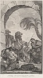Step into the enchanting world of 18th-century French Rococo art with *The Chapel of the Enfants-Trouvés in Paris: La Suite des rois mages: chameliers et porteurs de présents* (1756), a masterful etching and engraving by designer Charles Joseph Natoire and engraver Étienne Fessard. This print captures a lively procession from the biblical Adoration of the Magi, focusing on camel drivers and gift-bearing attendants trailing the Three Kings. Vividly rendered men and camels evoke the exotic splendor of the Epiphany story, their dynamic poses and intricate details showcasing Natoire's flair for gr...