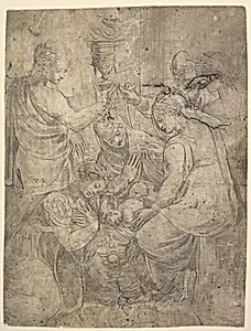 Andrea Schiavone, born Andrea Meldolla around 1510 or 1515 in Zara (modern Zadar, Croatia), in Venetian-ruled Dalmatia, hailed from a family rooted in Meldola near Forlì in Romagna, Emilia-Romagna. His father, Simon Meldolla, served as a garrison commander there, and both parents originated from Meldola, where the family held property into the early 16th century. Nicknamed "Schiavone"—"the Slav"—a...