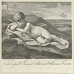 The Christ Child sleeping on a cross in a landscape, crown of thorns in the foreground, after Reni