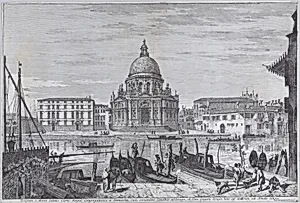 The church of Santa Maria della Salute seen across the water with gondolas in the foreground