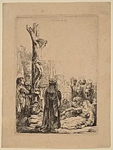 In the hushed drama of Rembrandt van Rijn's *The Crucifixion: Plate* (c. 1635), we witness the Dutch master's profound engagement with one of Christianity's most poignant moments. Created during the height of the Dutch Golden Age, this etching Christ on the cross amid mourning figures, rendered with Rembrandt's signature chiaroscurodeep shadows contrasting luminous highlights to evoke raw emotion and spiritual depth. As a Baroque artist, Rembrandt infused religious subjects with human intimacy, drawing from his Protestant milieu where personal faith resonated deeply. Etching, Rembrandt's favored printmaking technique, allowed him unparalleled control: he bit acid into a copper plate to create delicate, velvety lines, producing editions that spread his genius affordably across Europe. This small plate (hence its name) exemplifies his innovative "open biting," yielding rich tonal variations that mimic oil painting's texture. Housed in the National Gallery of Art's Rosenwald Collection (Department CG-E), it stands as a testament to Rembrandt's printmaking prowess, blending technical virtuosity with empathetic storytelling. Visitors are drawn to its intimate scale—ideal for contemplation—revealing how 17th-century art bridged divine narrative and everyday devotion, influencing generations of printmakers.
