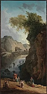 In the late 1770s, French painter Hubert Robert captured the elegance and fantasy of 18th-century leisure in *The Dance* (1777–79), an oil-on-canvas masterpiece now gracing the Metropolitan Museum of Art. Measuring over five feet tall, this vertically oriented work depicts men and women joyfully dancing amid a dramatic natural setting featuring cascading waterfalls. Robert, often called "Robert des Ruines" for his evocative architectural landscapes, blends real and imagined elements here, evoking the Romantic spirit just before the French Revolution. Robert's neoclassical training shines thro...