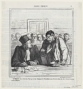 The defendant (whispering to his lawyer): All this seems to bore the president. Why don't you just suggest to simply let me go home, from 'Parisian sketches,' published in Le Charivari, February 17, 1866