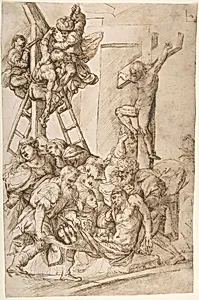 Domenico Campagnola's *The Deposition from the Cross (1537–1550) a pivotal moment from the Passion of Christ: the solemn removal of Jesus's body from the cross following the Crucifixion. Rendered in pen and brown ink, this measures 14 3/4 x 9 5/16 inches and exemplifies the Venetian Renaissance tradition. Campagnola, a draughtsman and print influenced by masters like Titian, employs fluid, expressive lines to convey the figures' grief and physical effort—men ascending ladders to lower the lifeless Christ, evoking deep religious emotion central to 16th-century Italian art. The medium of pen an...