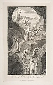 Behold *The Descent of Man into Vale of Death*, a poignant engraving from William Blake illustrations for Robert Blair's 174 poem *The Grave*. Created in collaboration with engraver Luigi Schiavonetti and publisher Rudolph Ackermann London, this 1813 plate captures Blake's visionary interpretation of mortality's inexorable pull. Blair's meditative "graveyard" poem reflects on death and the afterlife, inspiring Blake's dramatic watercolors, which Schiavonetti masterfully translated into intricate engravings for wider dissemination. Printed on a modest plate (9 1/2 x 5 5/16 inches), the work ex...